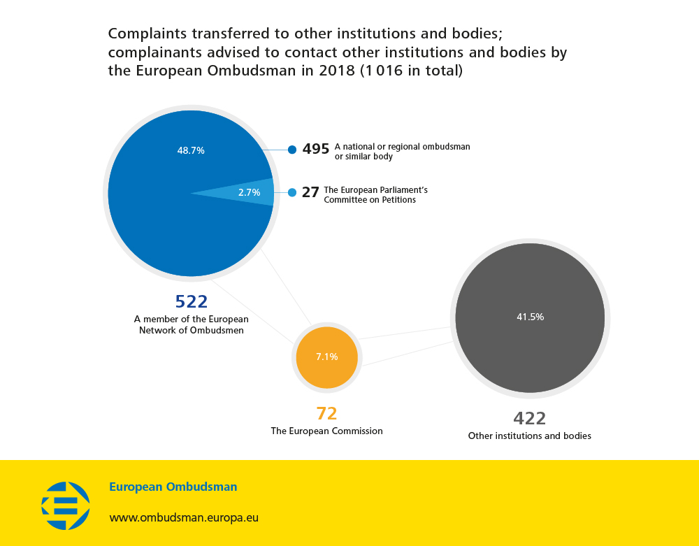 Complaints transferred to other institutions and bodies; complainants advised to contact other institutions and bodies by the European Ombudsman in 2018 (1 016 in total) |