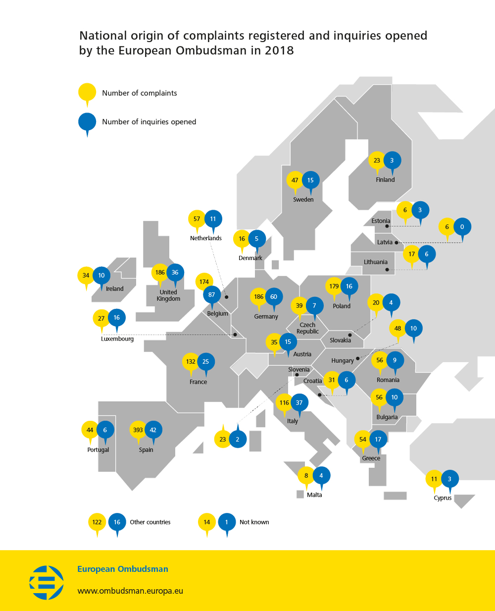 National origin of complaints registered and inquiries opened by the European Ombudsman in 2018